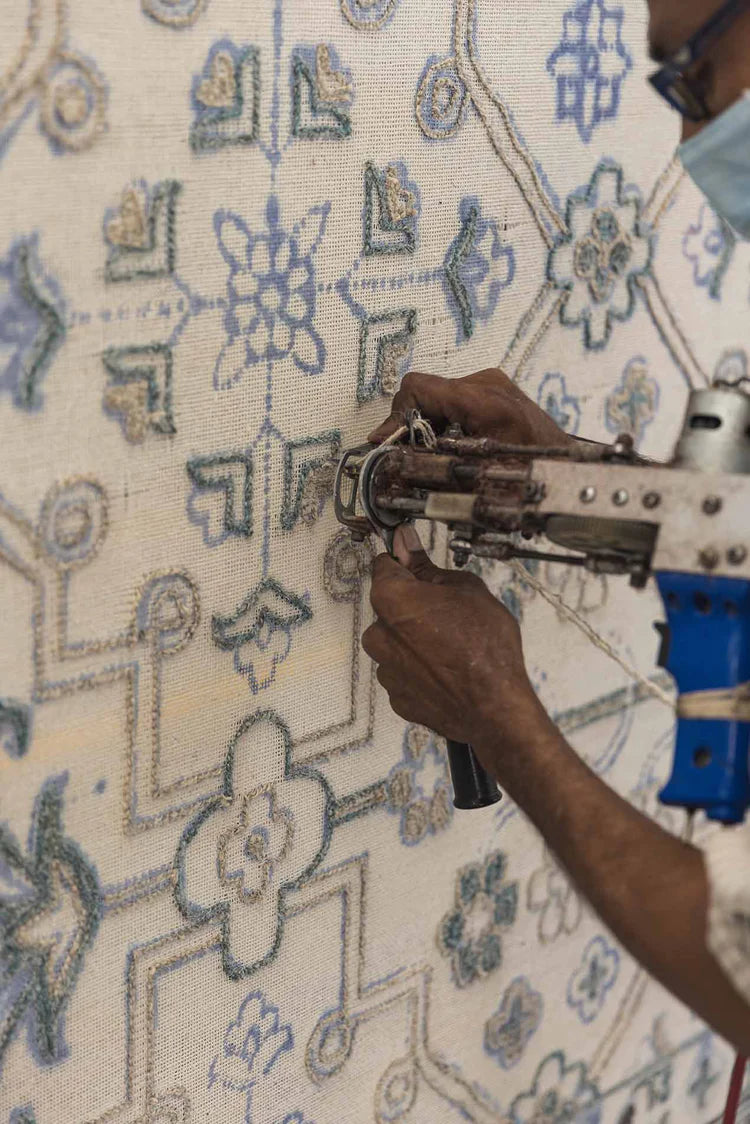 Yarn is hand-punched through a pre-woven fabric with a specialized tufting gun. The hand-tufted construction features precise designs, often has a plush pile, and is made of wool and/or viscose fibers. There are a few rug-making techniques within the hand-tufted construction, including the hand-hooked process. Hand-hooked rugs are not sheared after the tufting process, which would create a smooth, cut pile, and instead have an uncut, looped pile. A cotton-latex backing is glued on to hold the knots in place, offering strength and rigidity to the rug.